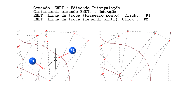 Modifica um par de triângulos trocando a aresta comum aos dois por uma outra formação possível. Para selecionar uma aresta você deve clicar em dois pontos, descrevendo assim uma linha cruzando a aresta desejada.
