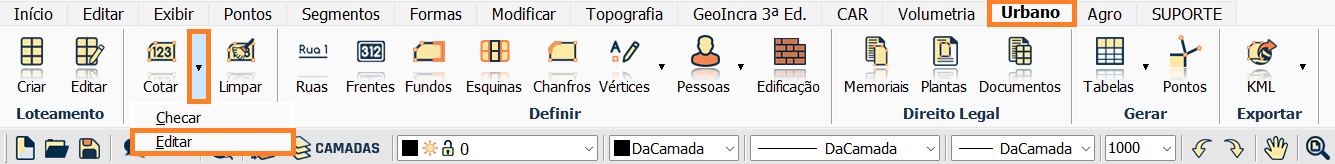 Para isso, clique na aba Urbano, seção Lotes & Quadras e selecione a ferramenta Editar.