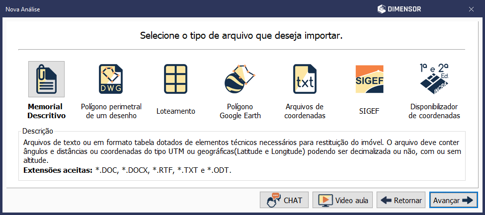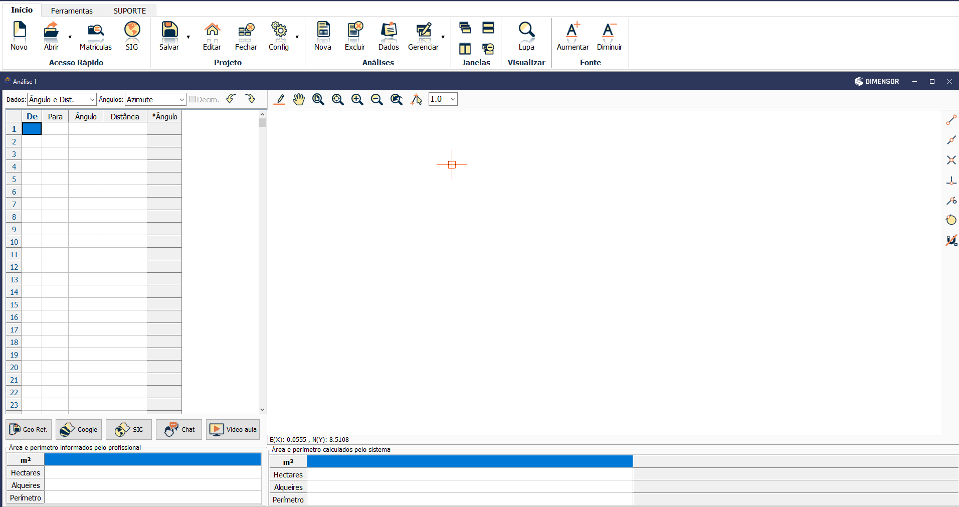 Nesta opção, você poderá restituir manualmente as informações do seu memorial descritivo, podendo realizar análises a partir de ângulos e distâncias ou coordenadas.