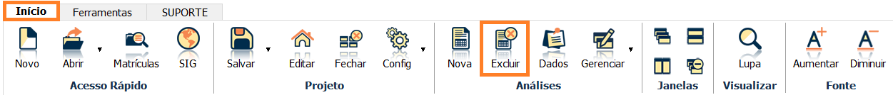 Se precisar excluir uma análise ativa do projeto atual, basta selecionar a análise desejada, ir na aba Início e selecionar a ferramenta Excluir.
