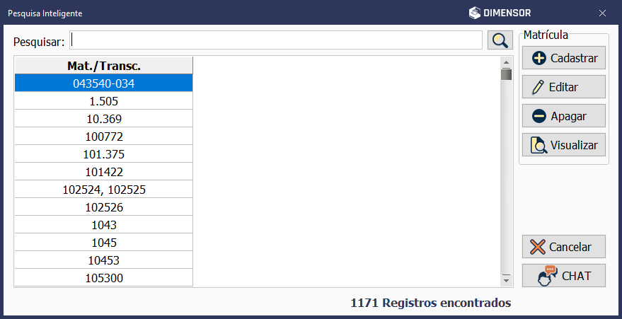 Ao clicar na ferramenta, irá abrir a tela de pesquisa com todos as matrículas salvas.