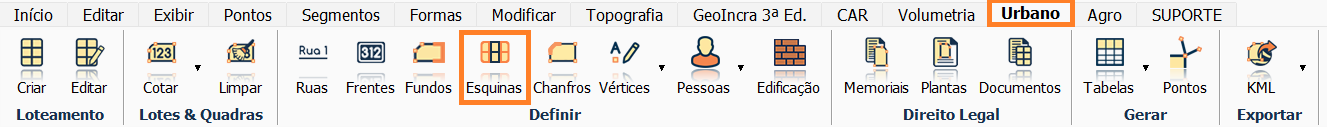 Após cotar os lotes e ter definido ruas e frentes, clique na aba Urbano e selecione a ferramenta Esquinas.