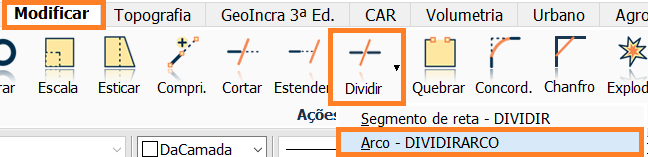 Para isso, clique na aba Início e selecione a ferramenta Dividir -> Arco.