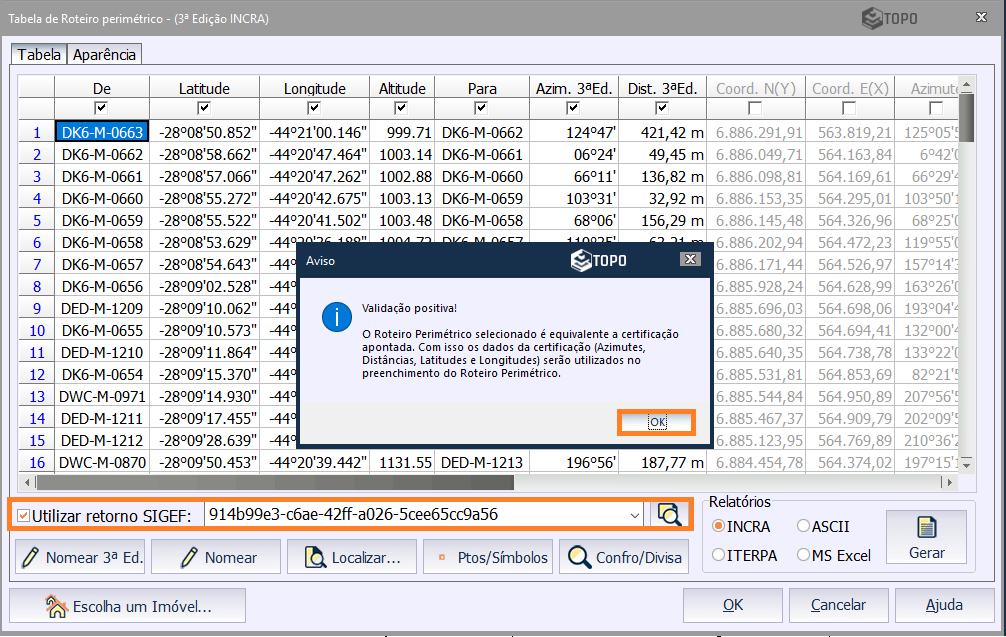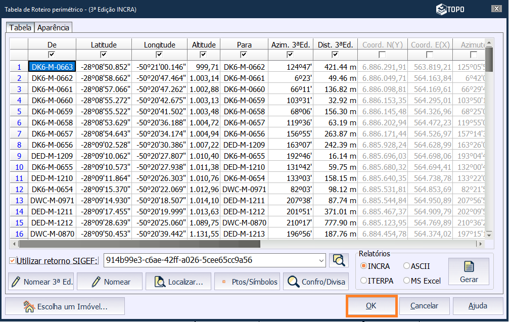 Clique em OK para gerar a tabela de roteiro perimétrico.