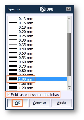 Habilitar a opção Exibir as espessuras das linhas, caso deseje visualizar no desenho, se não, desabilite-a.