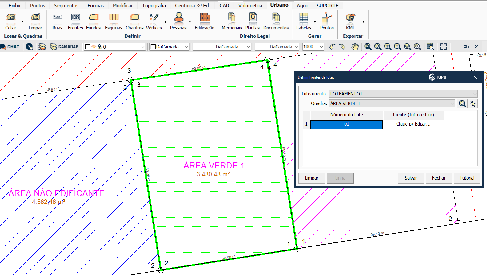 Lembre-se de definir frentes para as áreas públicas cotadas também como: área institucional, área loteada, área não edificante, área verde, praças e reservas urbanas.