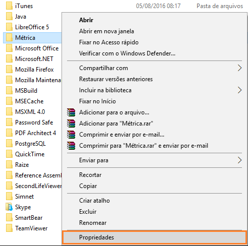 Na pasta Métrica, clique com o botão direito do mouse na opção Propriedades.