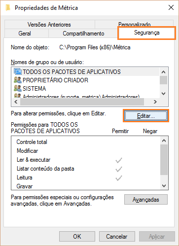 Selecione a aba Segurança e clique em Editar.