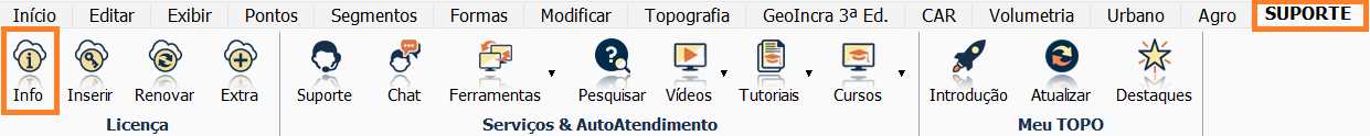 Na aba SUPORTE do Métrica TOPO, você poderá verificar as informações sobre sua licença, para isso, basta clicar em Info.