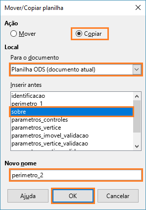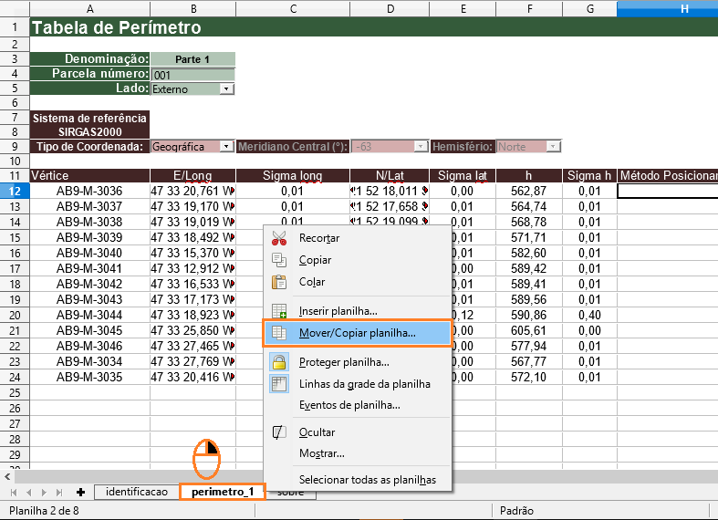 Para isso, o primeiro passo é clicar com o botão direito do mouse sobre o nome da aba “perimetro_1”, escolher a opção “Mover/Copiar planilha” (no rodapé da folha da planilha).