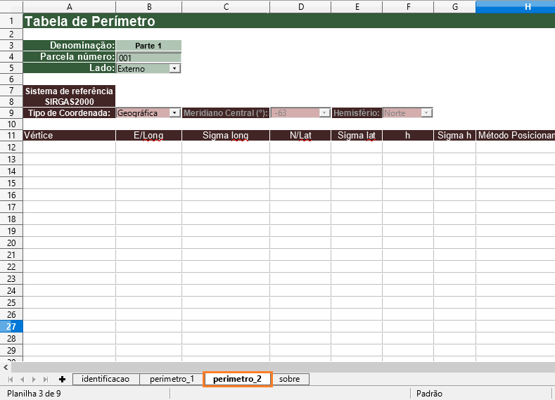 Para os casos de múltiplas parcelas e vazio interno ou área encravada, é necessário incluir outra(s) aba(s) de perímetro para descrever o(s) outro(s) perímetro(s) que constitui(em) a área georreferenciada como um todo.