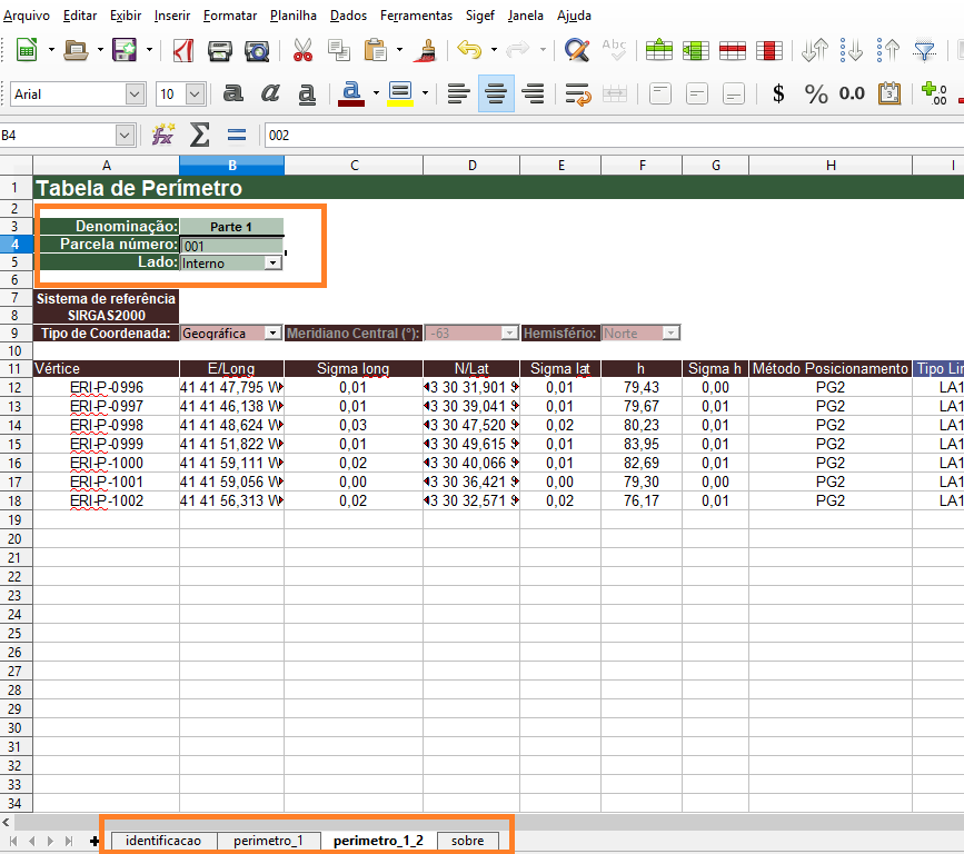 Na Planilha de dados cartográficos, verifique os dados do perímetro interno e preencha as informações do Método de Posicionamento.