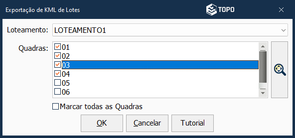 Esta ferramenta permite exportar lotes em KML, a partir da seleção por quadras.