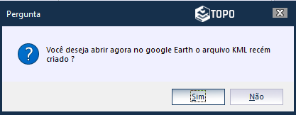 Ao clicar em criar KML, ele irá solicitar a pasta de destino para salvar o arquivo e logo em seguida a pergunta se deseja abrir o KML automaticamente no Google Earth Pro, para isso, é necessário ter instalado na máquina o programa Google Earth Pro.