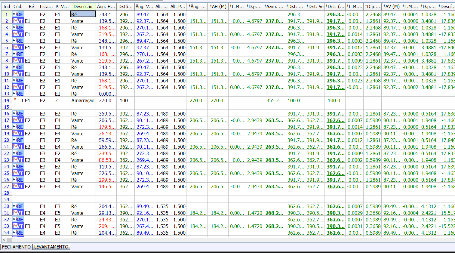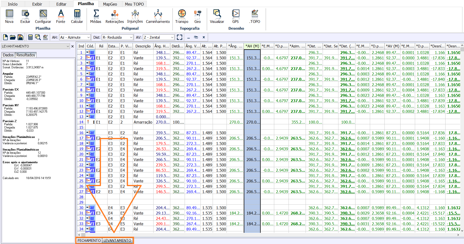 Os cálculos das médias dos ângulos e desníveis serão feitos e exibidos na planilha calculada.