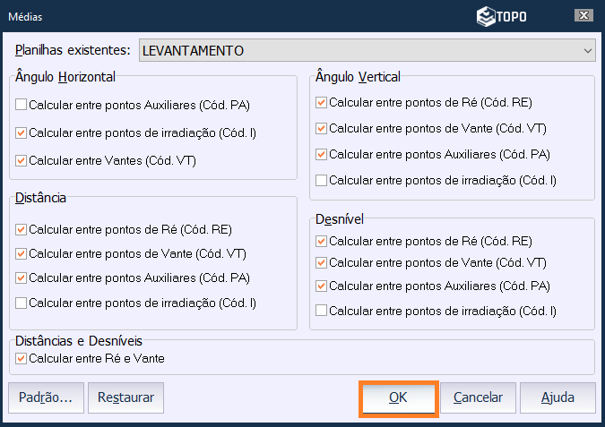 Após clicar, irá abrir uma tela para configurar suas preferências do cálculo da média. Poderá configurar para que calcule a média do ângulo horizontal, ângulo verticual, distância, desnível e distâncias e desníveis.