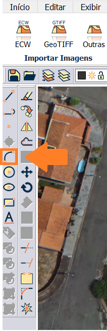 Para desenhar um arco no ambiente RASTER, selecione a ferramenta arco conforme imagem abaixo.