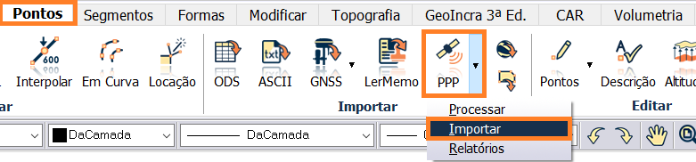 Neste tutorial, iremos aprender como Importar um arquivo já processado, para isso, basta ir na aba PONTOS e selecionar a ferramenta PPP conforme imagem abaixo: