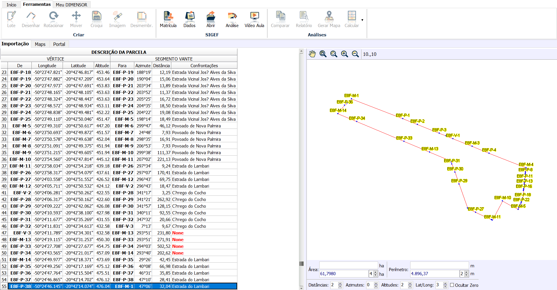 A partir desta ferramenta é possível gerar análise da matrícula importada pelo SIGEF no Métrica DIMENSOR, assim podendo plotar no Google e no SIG a análise restituída.