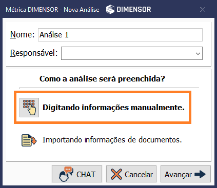 A próxima tela de assistente de criação de uma nova análise, selecione a opção como pretende realizar a nova análise, neste caso iremos desenhar o polígono, portanto, selecione a opção "Digitando informações manualmente" e clique em Avançar.