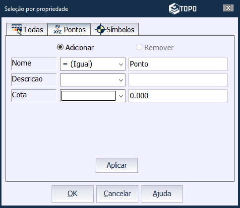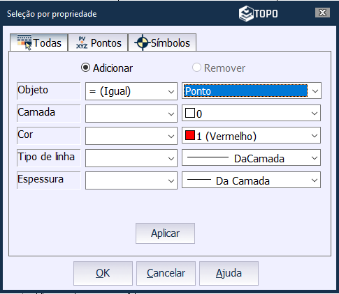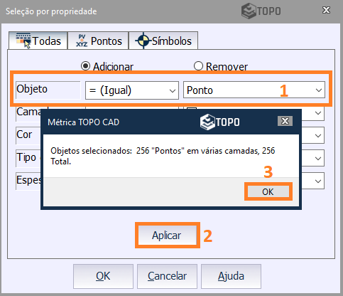 Vamos selecionar facilmente todos os pontos do projeto, para isso, vamos na aba TODAS, na seção Objeto -> Igual -> Ponto, clique em Aplicar. Irá selecionar automaticamente todos os pontos no projeto.