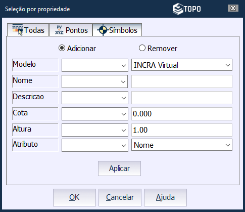 Em SÍMBOLOS, podemos selecionar por modelo, nome, descrição, cota, altura e atributo.