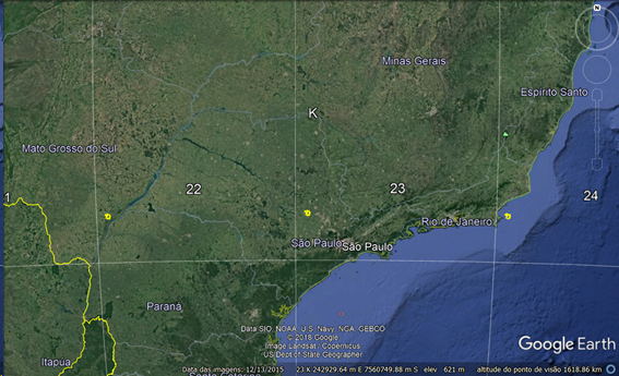 O imóvel em destaque na cor amarela possui as mesmas coordenadas nos eixos E(X) e N(Y), porém foram utilizados 3 (três) MC diferentes, assim, a área que deveria estar em Piracicaba interior de São Paulo simbolizado pelo fuso 23, quando adotado o fuso 22 (MC 51°) é direcionada para o estado do Mato Grosso do Sul e utilizando o fuso 24 (MC 39°), o objeto de interesse apareceu no litoral do Rio de Janeiro.
