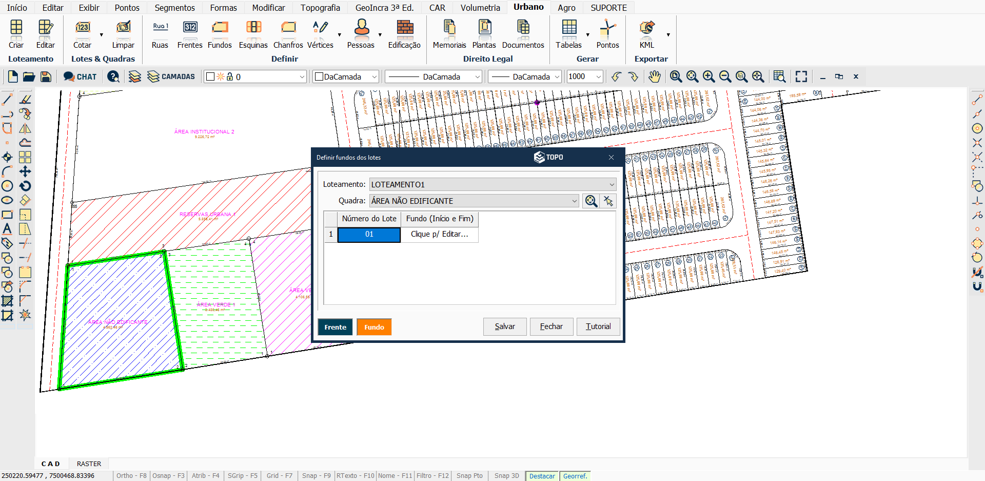 Lembre-se de definir fundos para as áreas públicas cotadas também como: área institucional, área loteada, área não edificante, área verde, praças e reservas urbanas.