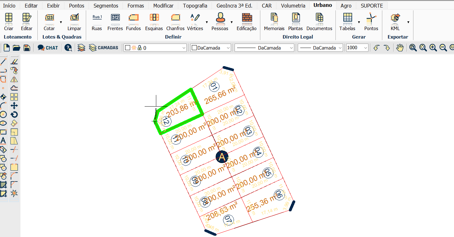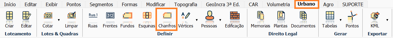 Para isso, com o projeto de loteamento já com os lotes cotados, definido ruas e frentes, vamos na aba URBANO na ferramenta definir CHANFRO.