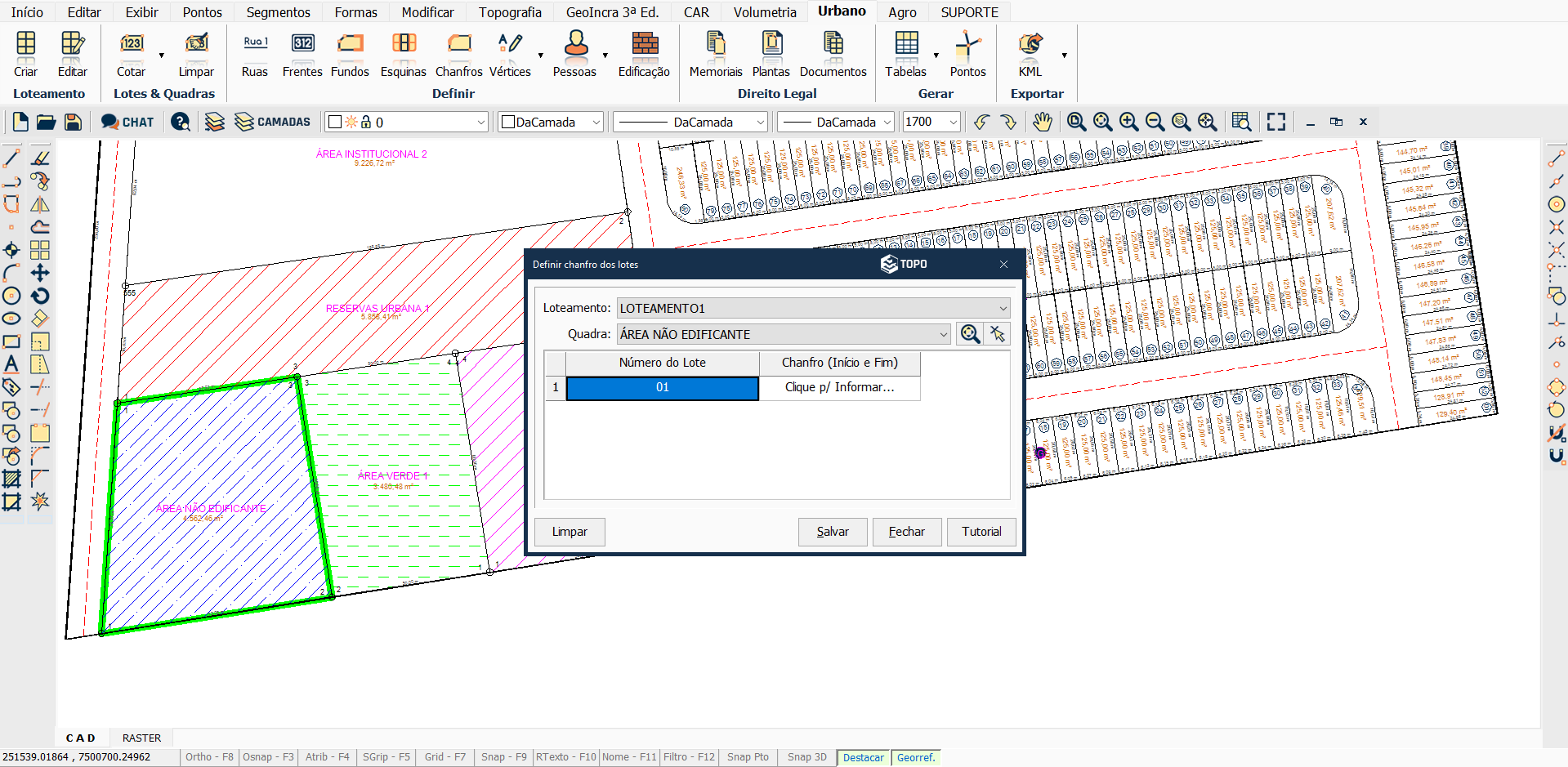 Lembre-se de definir chanfros para as áreas públicas cotadas também como: área institucional, área loteada, área não edificante, área verde, praças e reservas urbanas.