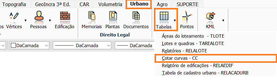 Para cotar curvas do loteamento e inserir uma tabela com suas informações, acesse a aba Urbano, ferramenta Tabelas, e clique na opção Cotar Curvas.